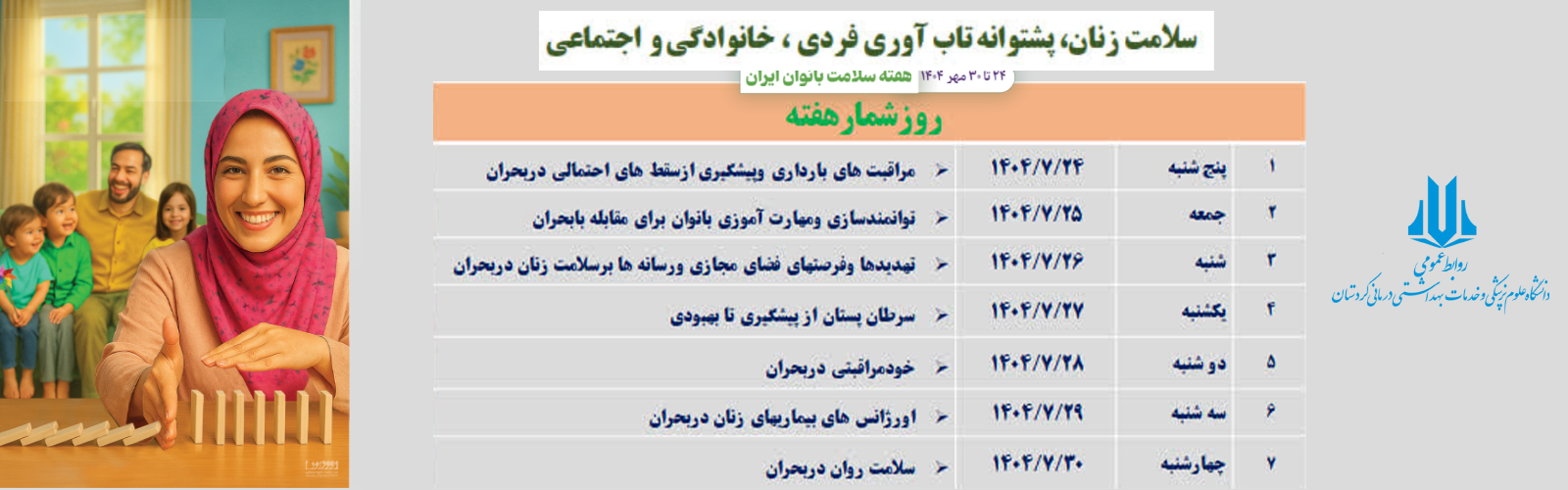 به گزارش روابط عمومی دانشگاه علوم پزشکی کردستان، دکتر خالد رحمانی معاون امور بهداشتی دانشگاه، در راستای هفته سلامت بانوان، شعار این هفته را سلامت زنان، پشتوانه تاب‌آوری فردی، خانوادگی و اجتماعی عنوان کرد و اظهار داشت: هفته سلامت بانوان ایران فرصتی ارزشمند است تا بار دیگر یادآوری کنیم که سلامت زنان، نه‌تنها ضامن آرامش و پویایی خانواده‌هاست، بلکه نقش تعیین‌کننده‌ای در سلامت کل جامعه دارد.