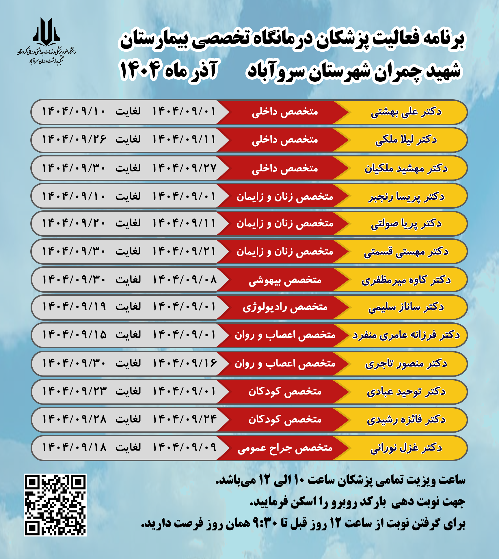 🔶️برنامه فعالیت پزشکان درمانگاه تخصصی بیمارستان شهید چمران شهرستان سروآباد "آذر ماه 1404"