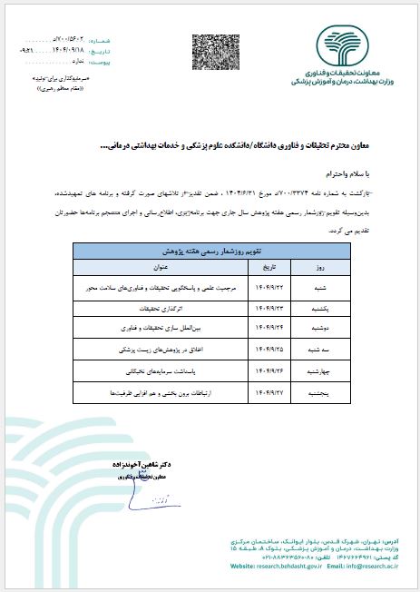 معاونت محترم تحقیقات و فناوری وزارت بهداشت، درمان و آموزش پزشکی، تقویم روزشمار رسمی هفته پژوهش سال جاری (۱۴۰۴) را جهت برنامهریزی و اجرای منسجم اعلام کرد.
